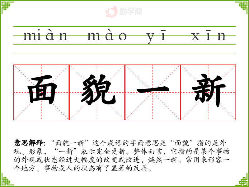 “面貌一新”这个成语的字面意思是“面貌”指的是外观、形象,“一新”表示完全更新。整体而言,它指的是某个事物的外观或状态经过大幅度的改变或改进,焕然一新。常用来形容一个地方、事物或人的状态有了显著的改善。
