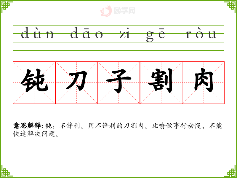 钝:不锋利。用不锋利的刀割肉。比喻做事行动慢,不能快速解决问题。