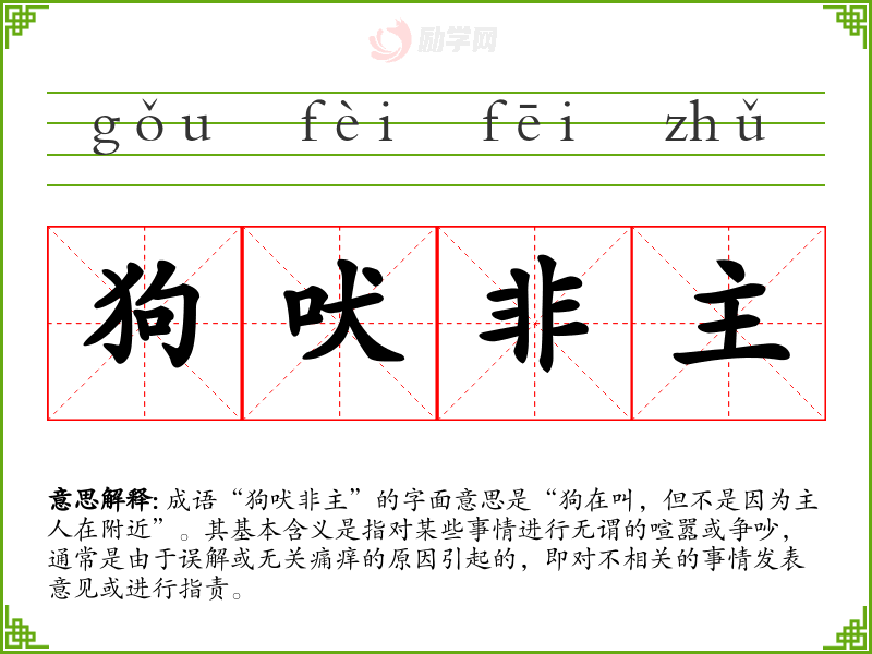 成语“狗吠非主”的字面意思是“狗在叫,但不是因为主人在附近”。其基本含义是指对某些事情进行无谓的喧嚣或争吵,通常是由于误解或无关痛痒的原因引起的,即对不相关的事情发表意见或进行指责。