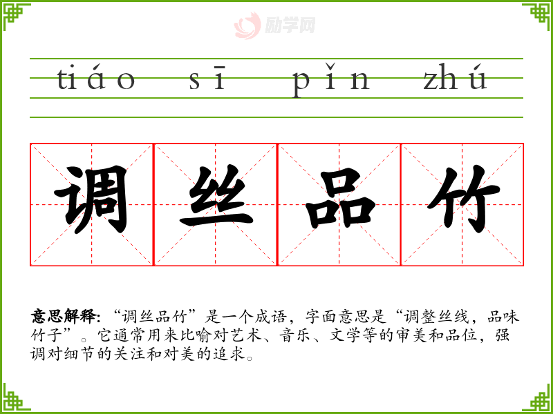 “调丝品竹”是一个成语,字面意思是“调整丝线,品味竹子”。它通常用来比喻对艺术、音乐、文学等的审美和品位,强调对细节的关注和对美的追求。