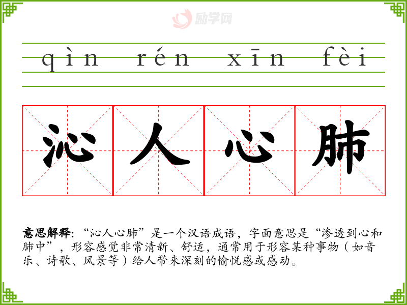 在我的生活中,曾经在一次音乐会上听到一首动人的乐曲,感受到一种“沁人心肺”的感觉,仿佛所有的烦恼都被洗净了。此后,我在与朋友分享这次经历时,使用了这个成语,帮助他们理解那种深刻的感动。