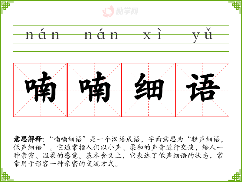 - 轻声细语:与“喃喃细语”相似,强调声音轻柔。