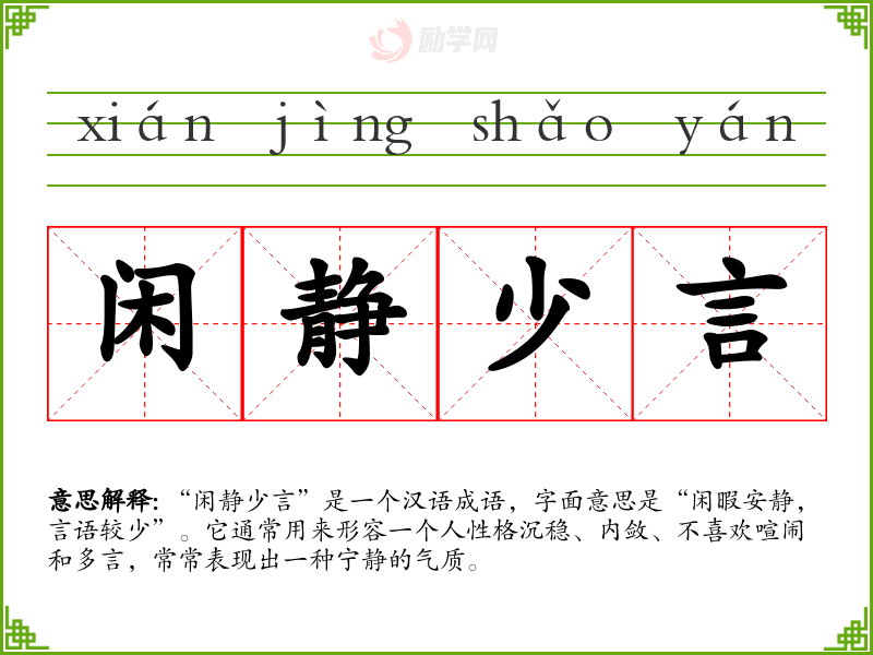 “闲静少言”是一个汉语成语,字面意思是“闲暇安静,言语较少”。它通常用来形容一个人性格沉稳、内敛、不喜欢喧闹和多言,常常表现出一种宁静的气质。