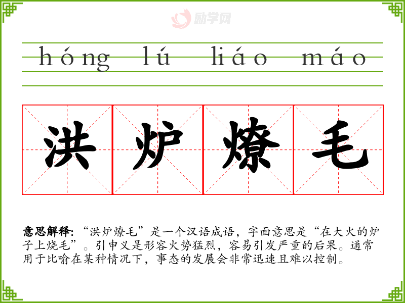 “洪炉燎毛”是一个汉语成语,字面意思是“在大火的炉子上烧毛”。引申义是形容火势猛烈,容易引发严重的后果。通常用于比喻在某种情况下,事态的发展会非常迅速且难以控制。
