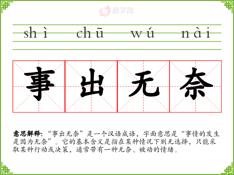 “事出无奈”是一个汉语成语,字面意思是“事情的发生是因为无奈”。它的基本含义是指在某种情况下别无选择,只能采取某种行动或决策,通常带有一种无奈、被动的情绪。