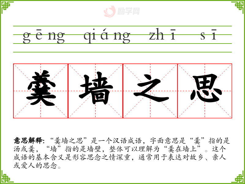 通过对“羹墙之思”的学,我更加理解了思念这一情感在语言表达中的重要性。这个成语不仅丰富了我的词汇,也让我在表达思乡或思念时有了更生动的选择。它在我的语言学和交流中具备了不可替代的价值。