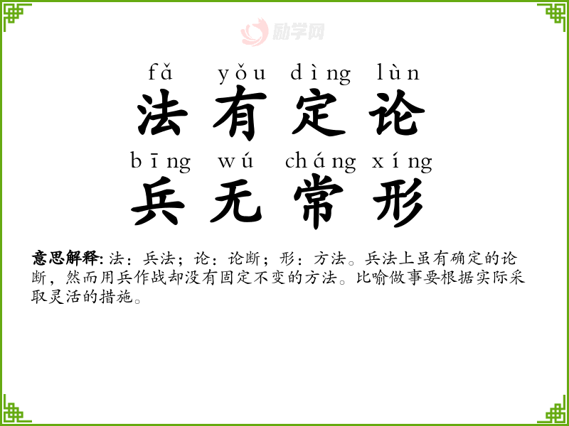 法:兵法;论:论断;形:方法。兵法上虽有确定的论断,然而用兵作战却没有固定不变的方法。比喻做事要根据实际采取灵活的措施。