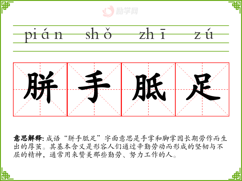 成语“胼手胝足”字面意思是手掌和脚掌因长期劳作而生出的厚茧。其基本含义是形容人们通过辛勤劳动而形成的坚韧与不屈的精神,通常用来赞美那些勤劳、努力工作的人。