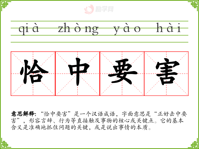 通过对“恰中要害”的分析,我认识到这个成语在日常沟通和问题解决中的重要性。它不仅是一个描述性的成语,更是一种思维方式,提醒我们在交流时要关注本质,提高表达的有效性。