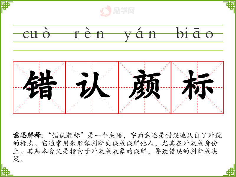 通过对“错认颜标”的学习,我认识到在沟通中准确理解他人身份的重要性。这不仅关乎社会交往的礼仪,也反映了对他人内涵的尊重。在语言学习和表达中,理解成语的深层含义能够帮助我更好地与他人交流,避免不必要的误解。