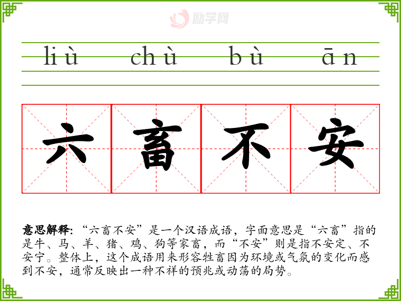 “六畜不安”是一个汉语成语,字面意思是“六畜”指的是牛、马、羊、猪、鸡、狗等家畜,而“不安”则是指不安定、不安宁。整体上,这个成语用来形容牲畜因为环境或气氛的变化而感到不安,通常反映出一种不祥的预兆或动荡的局势。