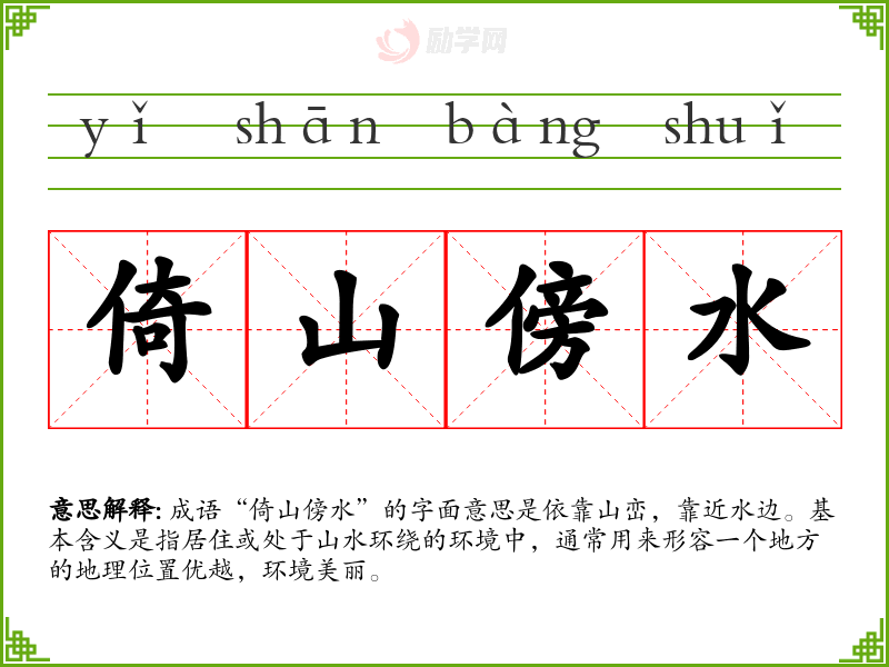 成语“倚山傍水”的字面意思是依靠山峦,靠近水边。基本含义是指居住或处于山水环绕的环境中,通常用来形容一个地方的地理位置优越,环境美丽。