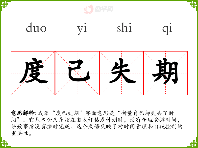 成语“度己失期”字面意思是“衡量自己却失去了时间”。它基本含义是指在自我评估或计划时,没有合理安排时间,导致事情没有按时完成。这个成语反映了对时间管理和自我控制的重要性。