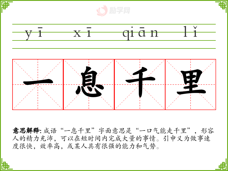 成语“一息千里”字面意思是“一口气能走千里”,形容人的精力充沛,可以在短时间内完成大量的事情。引申义为做事速度很快,效率高,或某人具有很强的能力和气势。