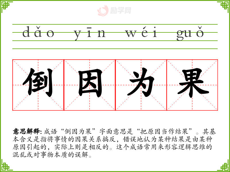 通过对“倒因为果”的学,我深刻认识到因果关系在逻辑思维中的重要性。这个成语不仅帮助我更好地理解语言中的逻辑,还促使我在日常生活中更加注意思考的严谨性。在语言学中,准确把握因果关系是有效沟通的基础。