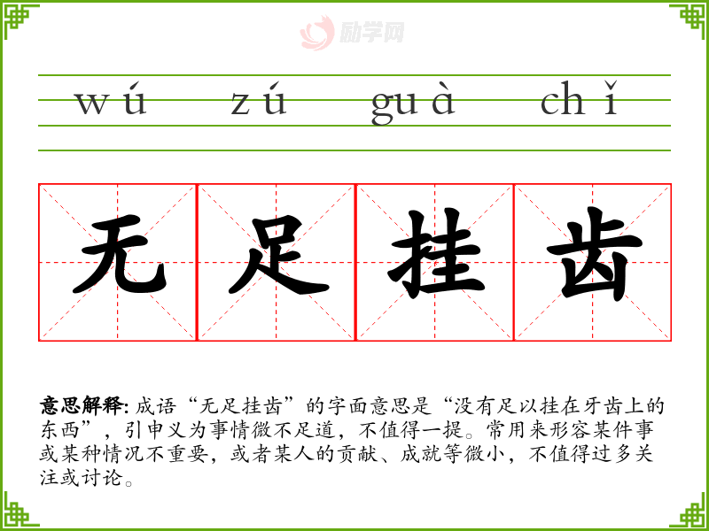 成语“无足挂齿”的字面意思是“没有足以挂在牙齿上的东西”,引申义为事情微不足道,不值得一提。常用来形容某件事或某种情况不重要,或者某人的贡献、成就等微小,不值得过多关注或讨论。