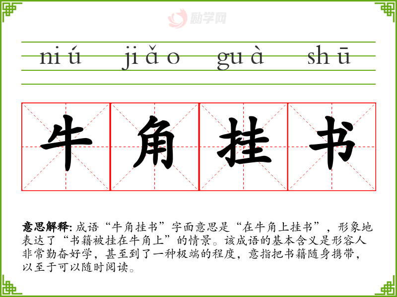 成语“牛角挂书”字面意思是“在牛角上挂书”,形象地表达了“书籍被挂在牛角上”的情景。该成语的基本含义是形容人非常勤奋好学,甚至到了一种极端的程度,意指把书籍随身携带,以至于可以随时阅读。