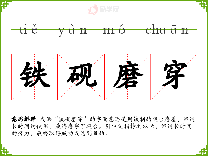 在我的学过程中,曾经历过一段时间的低迷,正是这句“铁砚磨穿”让我重新振作起来,提醒我只要坚持下去,就一定会有收获。我将其应用到我的学计划中,设定了长远目标,逐步实现。