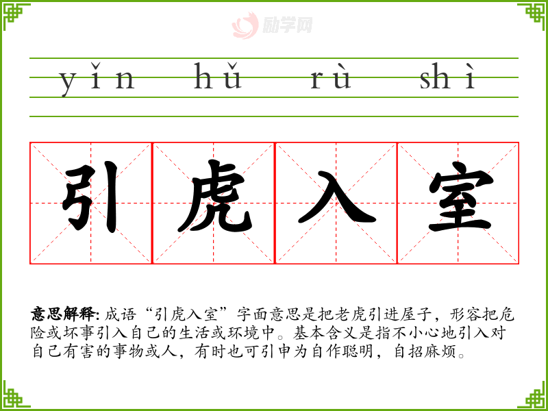 成语“引虎入室”字面意思是把**引进屋子,形容把危险或坏事引入自己的生活或环境中。基本含义是指不小心地引入对自己有害的事物或人,有时也可引申为自作聪明,自招麻烦。