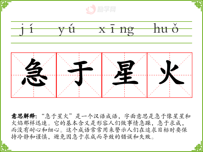 “急于星火”是一个汉语成语,字面意思是急于像星星和火焰那样迅速。它的基本含义是形容人们做事情急躁,急于求成,而没有耐心和细心。这个成语常常用来警示人们在追求目标时要保持冷静和谨慎,避免因急于求成而导致的错误和失败。