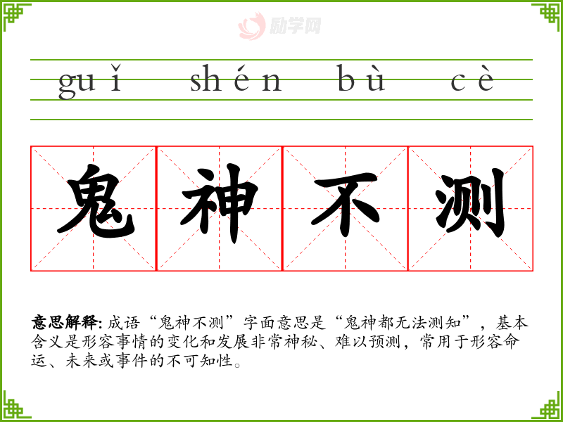 成语“鬼神不测”字面意思是“鬼神都无法测知”,基本含义是形容事情的变化和发展非常神秘、难以预测,常用于形容命运、未来或**的不可知性。