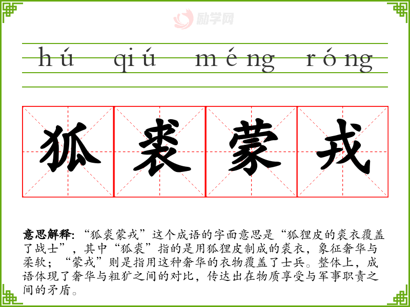 “狐裘蒙戎”这个成语的字面意思是“狐狸皮的裘衣覆盖了战士”,其中“狐裘”指的是用狐狸皮制成的裘衣,象征奢华与柔软;“蒙戎”则是指用这种奢华的衣物覆盖了士兵。整体上,成语体现了奢华与粗犷之间的对比,传达出在物质享受与军事职责之间的矛盾。