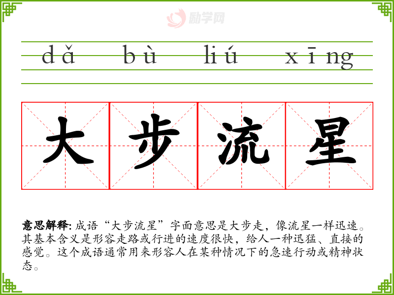 通过对“大步流星”的学习,我对这个成语的含义和使用有了更深入的理解。它不仅在语言表达中起到丰富的作用,也反映了人们对速度和效率的追求。在日常生活中,适当运用这个成语,可以使表达更生动,并传达出积极向上的态度。