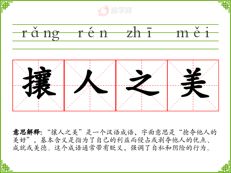 通过对“攘人之美”的学,我更加深刻地理解了自私行为对个人和社会的危害。在语言学中,理解成语的深层含义能够帮助我更准确地表达思想,同时也提醒我在日常生活中践行正义和互助的价值观。