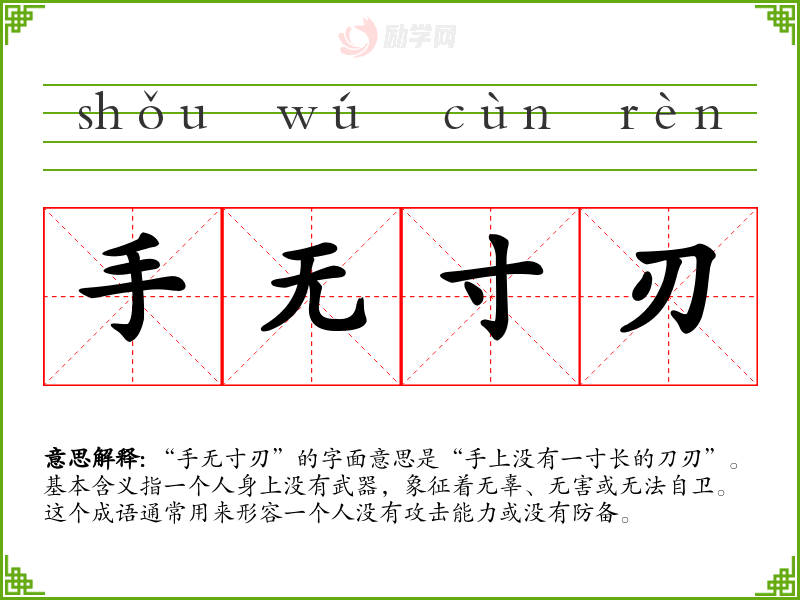 “手无寸刃”的字面意思是“手上没有一寸长的刀刃”。基本含义指一个人身上没有武器,象征着无辜、无害或无法自卫。这个成语通常用来形容一个人没有攻击能力或没有防备。