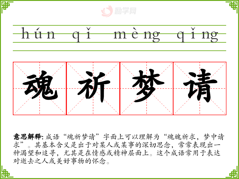 成语“魂祈梦请”字面上可以理解为“魂魄祈求,梦中请求”。其基本含义是出于对某人或某事的深切思念,常常表现出一种渴望和追寻,尤其是在情感或精神层面上。这个成语常用于表达对逝去之人或美好事物的怀念。