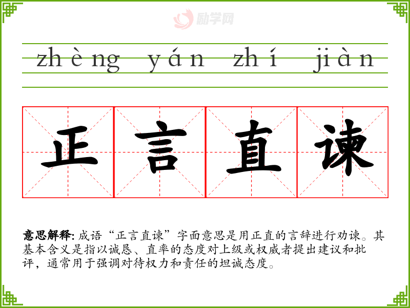 成语“正言直谏”字面意思是用正直的言辞进行劝谏。其基本含义是指以诚恳、直率的态度对上级或权威者提出建议和批评,通常用于强调对待权力和责任的坦诚态度。