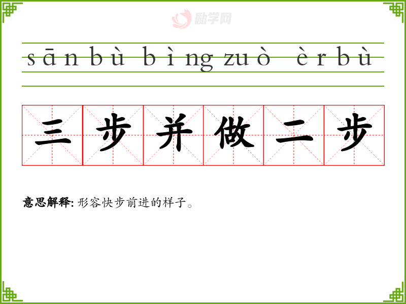 《儒林外史》第十六回:“匡超人三步并作两步,跑到家里。”