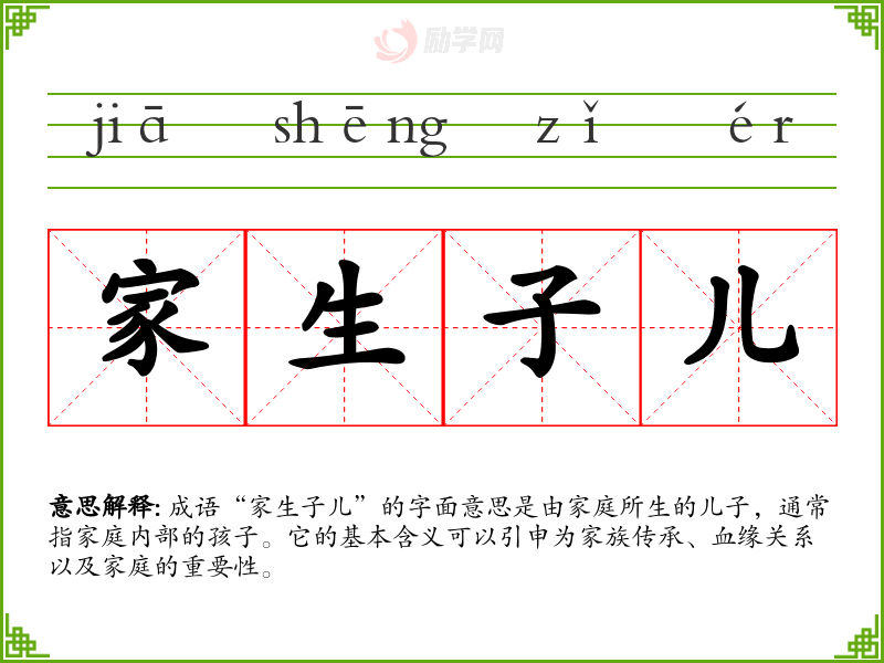 成语“家生子儿”的字面意思是由家庭所生的儿子,通常指家庭内部的孩子。它的基本含义可以引申为家族传承、血缘关系以及家庭的重要性。