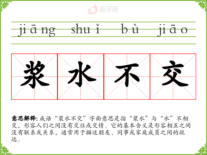 成语“浆水不交”字面意思是指“浆水”与“水”不相交,形容人们之间没有交往或交情。它的基本含义是形容相互之间没有联系或关系,通常用于描述朋友、同事或家庭成员之间的疏远。