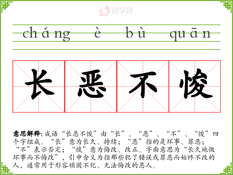 成语“长恶不悛”由“长”、“恶”、“不”、“悛”四个字组成。“长”意为长久、持续;“恶”指的是坏事、罪恶;“不”表示否定;“悛”意为悔改、改正。字面意思为“长久地做坏事而不悔改”,引申含义为指那些犯了错误或罪恶而始终不改的人,通常用于形容顽固不化、无法悔改的恶人。