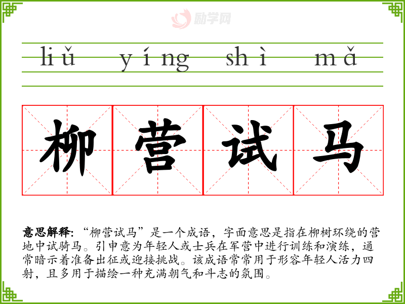 “柳营试马”是一个成语,字面意思是指在柳树环绕的营地中试骑马。引申意为年轻人或士兵在军营中进行训练和演练,通常暗示着准备出征或迎接挑战。该成语常常用于形容年轻人活力四射,且多用于描绘一种充满朝气和斗志的氛围。
