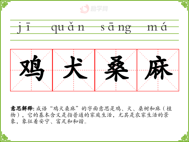 成语“鸡犬桑麻”的字面意思是鸡、犬、桑树和麻(植物),它的基本含义是指普通的家庭生活,尤其是农家生活的景象,象征着安宁、富足和和谐。