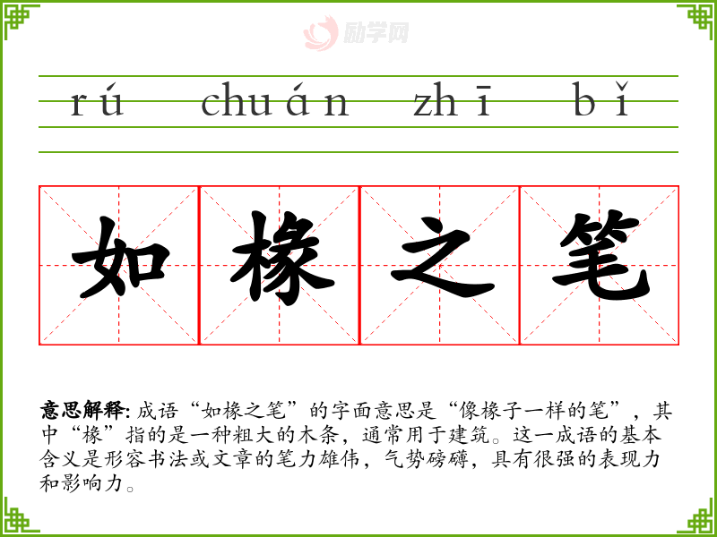 成语“如椽之笔”的字面意思是“像椽子一样的笔”,其中“椽”指的是一种粗大的木条,通常用于建筑。这一成语的基本含义是形容书法或文章的笔力雄伟,气势磅礴,具有很强的表现力和影响力。