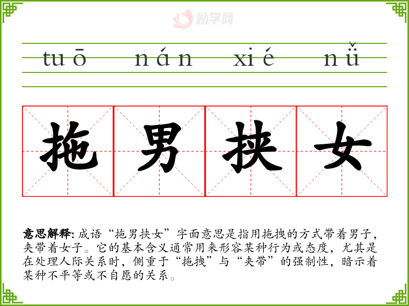 成语“拖男挟女”字面意思是指用拖拽的方式带着男子,夹带着女子。它的基本含义通常用来形容某种行为或态度,尤其是在处理人际关系时,侧重于“拖拽”与“夹带”的强制性,暗示着某种不平等或不自愿的关系。