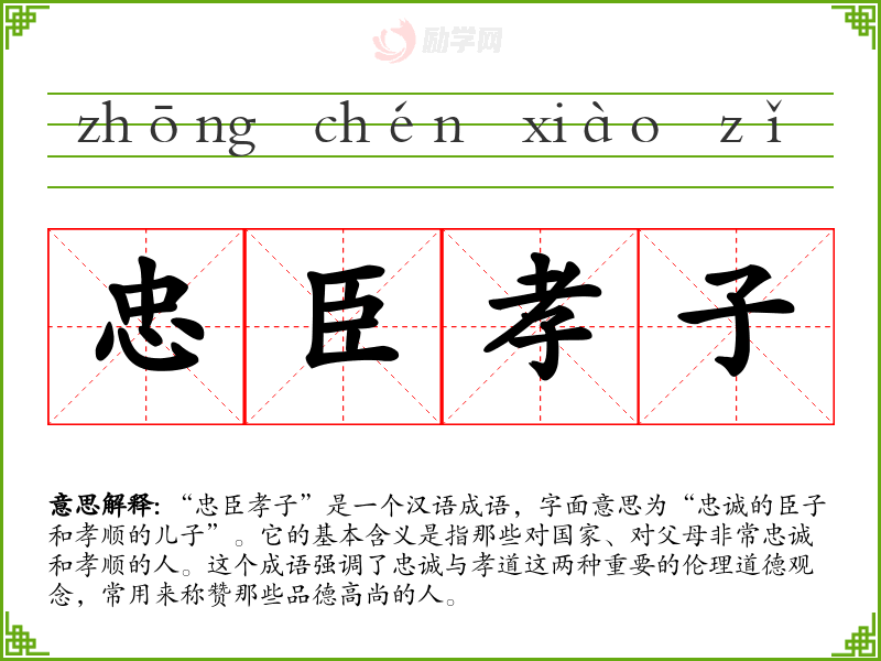 通过对“忠臣孝子”的学,我意识到忠诚与孝道在个人品德和社会和谐中扮演着重要角色。它不仅对我在语言学中的表达能力有帮助,也让我在生活中更加关注家庭和社会责任,激励我成为一个更好的人。
