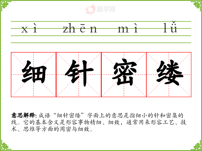 通过对“细针密缕”的学*,我意识到细致与周到在生活和工作中的重要性。这一成语教会我在表达时注重细节,提升了我的语言能力和思维深度。