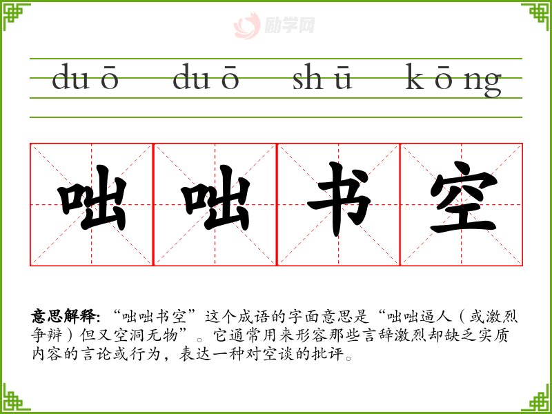 - 日常对话:在讨论某些人或事时,可以用来表达对空洞言辞的批评。