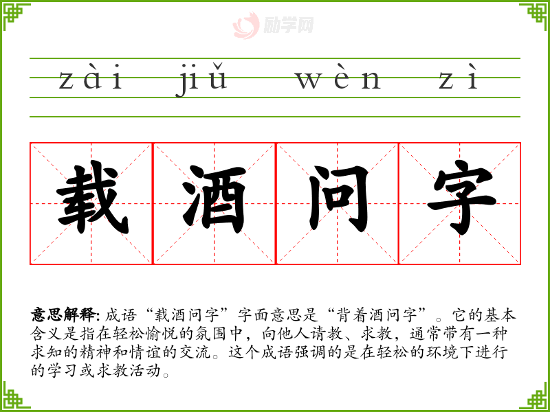 成语“载酒问字”字面意思是“背着酒问字”。它的基本含义是指在轻松愉悦的氛围中,向他人请教、求教,通常带有一种求知的精神和情谊的交流。这个成语强调的是在轻松的环境下进行的学*或求教活动。