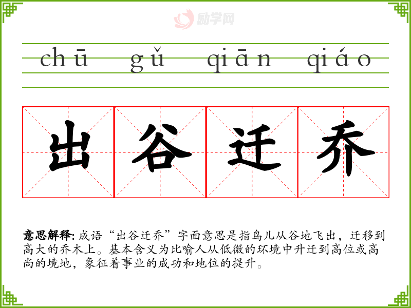 成语“出谷迁乔”字面意思是指鸟儿从谷地飞出,迁移到高大的乔木上。基本含义为比喻人从低微的环境中升迁到高位或高尚的境地,象征着事业的成功和地位的提升。
