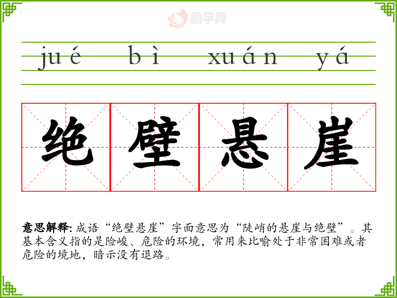 成语“绝壁悬崖”字面意思为“陡峭的悬崖与绝壁”。其基本含义指的是险峻、危险的环境,常用来比喻处于非常困难或者危险的境地,暗示没有退路。