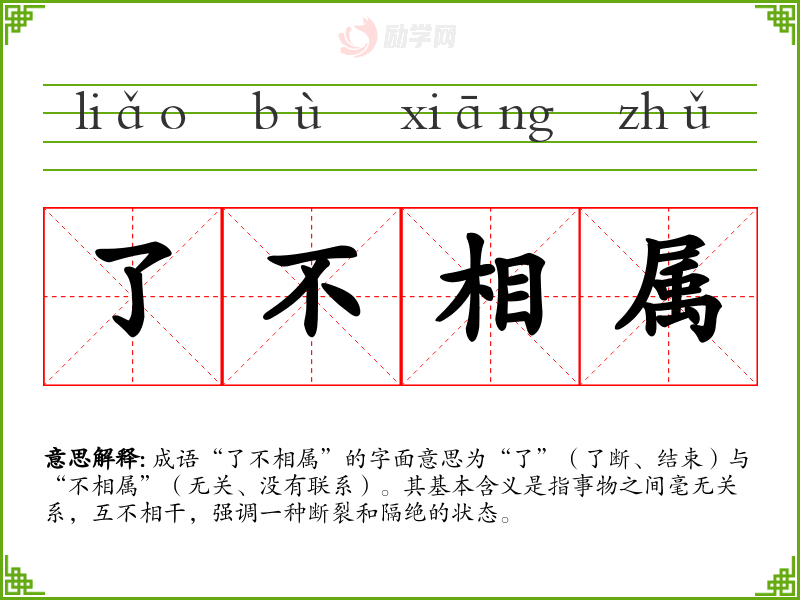 成语“了不相属”的字面意思为“了”(了断、结束)与“不相属”(无关、没有联系)。其基本含义是指事物之间毫无关系,互不相干,强调一种断裂和隔绝的状态。