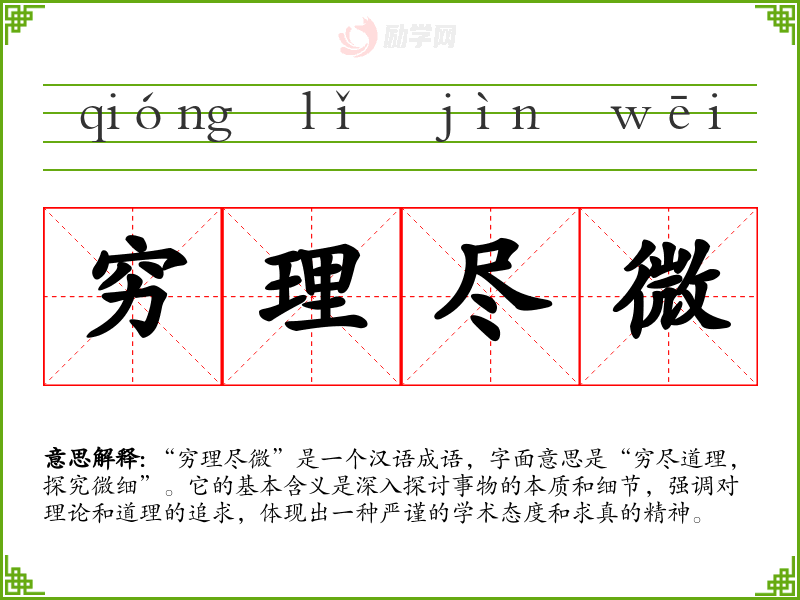 通过对“穷理尽微”的学,我深刻体会到深入思考的重要性。这个成语不仅丰富了我的词汇与表达能力,也激励我在以后的学和生活中,始终保持对知识的渴求和对真理的追求。