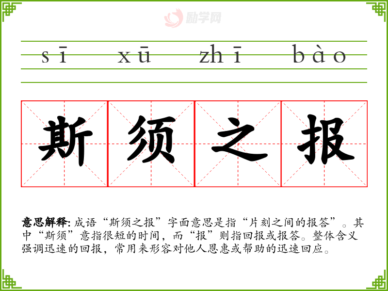 通过对“斯须之报”的深入理解,我认识到它不仅是一个成语,更是人际交往中一种期待和信念。它在我语言学*和表达中扮演着重要角色,提醒我在与人交往时,及时回报和表达感激的重要性。