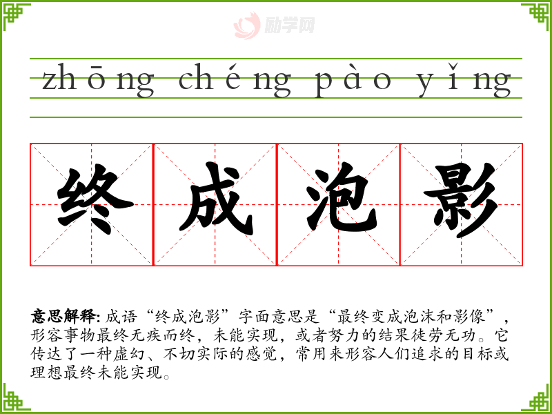 通过对成语“终成泡影”的深入分析,我认识到它不仅是一个形容词,更是对人生哲学的反思。在语言学*中,理解并使用这样的成语能够帮助我更准确地表达复杂的情感和思想,丰富我的语言表达能力。