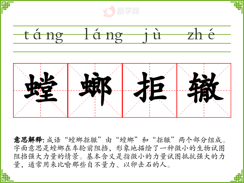 - 日常对话:朋友之间讨论某人过于自信地挑战不可能的事情时,可以用“螳螂拒辙”来形象地说明。